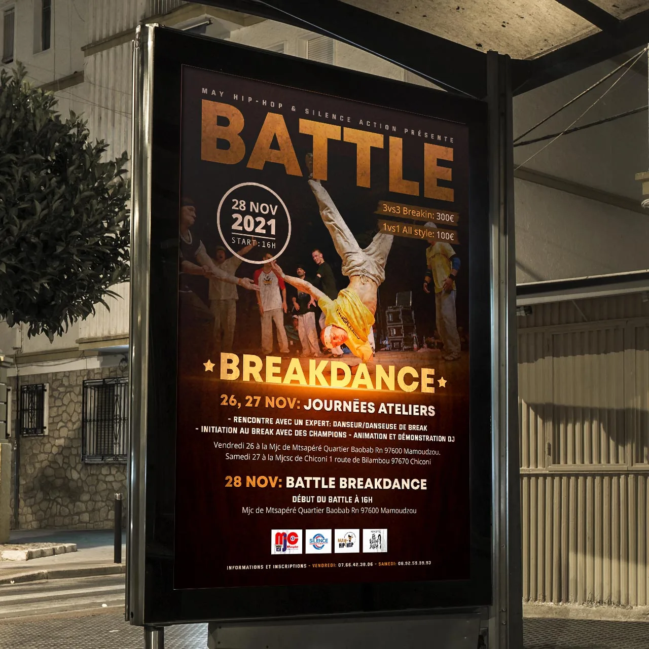 We created a poster to promote the Breakdance Battle event in Mamoudzou, Mayotte, held on November 26-27, 2021, featuring 3vs3 and 1vs1 competitions. The design embodies the spirit of hip-hop culture, aiming to enhance visibility and attract attendees to the event. It was adapted for various formats and media to ensure consistent visibility across all channels.